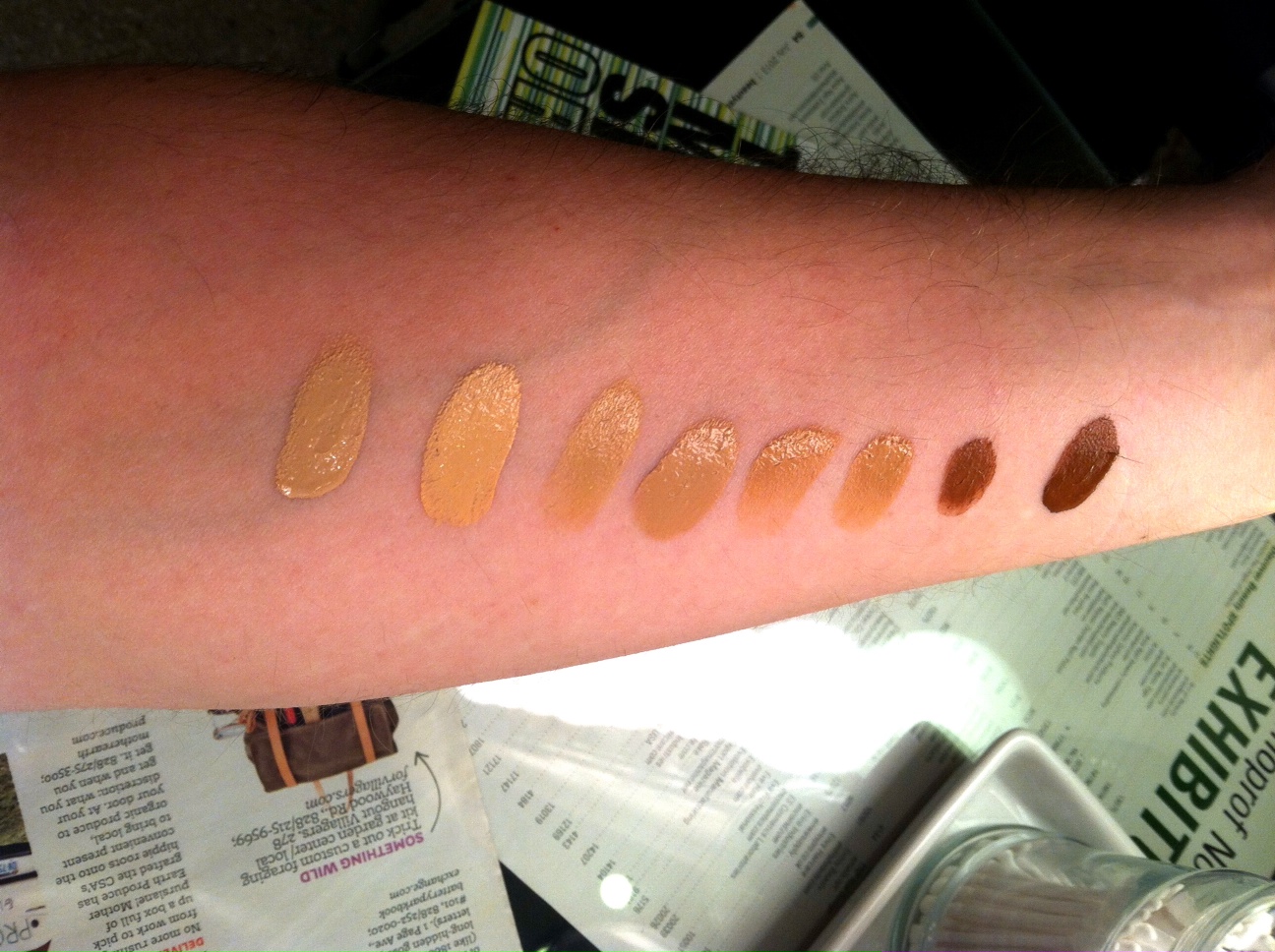 So we have been getting a lot questions on the SerenityScott skin perfecting foundations, as in “How do I match myself via the computer?” So I thought I would line them up on my arm as a color reference. From left to right we have s.p.f. number 1 and ending on s.p.f. number 8. Number 1 and 2 are tricky in the sense that they are the same tone, shade of darkness, however they are different in hue, number 1 is more of a pink shade and number 2 has more golden tones. I am a number two. Hope this helps. If you guys have any questions feel free to email me at zack@makeupatga.com .